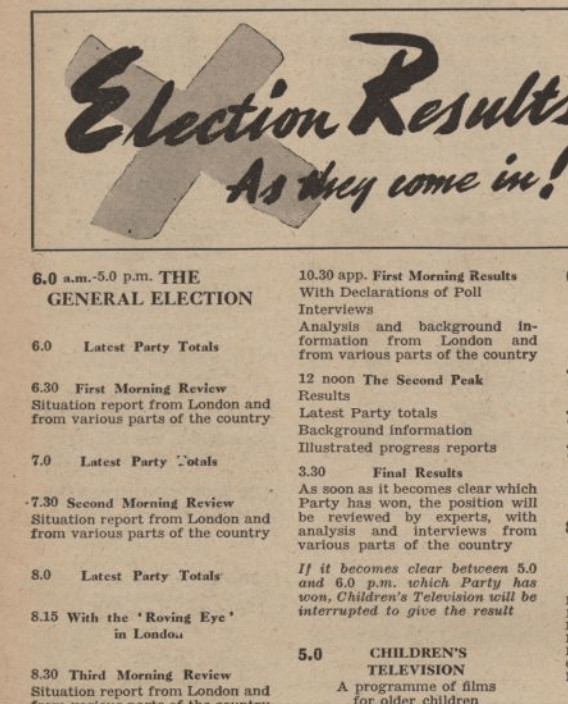 The BBC’s first big tilt at covering a general election saw the transmitters splutter into life at an unearthly hour for the first time. The 1950 General Election (23 February 1950, five seat Labour majority) had merely seen a modest fifteen-minute bulletin at 8:15pm, albeit with the promise of “maps and animated diagrams”. The following year’s election (25 October 1951, 17 seat Conservative majority) saw BBCtv stay up later than ever before, with live Thursday night coverage continuing until 4am, though the results team were then given six hours’ sleep before coverage resumed at 10am.