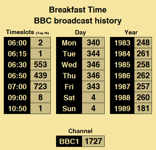 1. Breakfast Time in fact ran for two weeks longer than listed in Radio Times, as the launch of BBC Breakfast News was delayed at short notice until 2nd October for some reason.