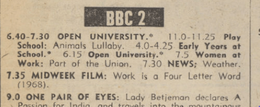 Initially going out in any spare off-piste part of the television schedules from 1971, OU programming primarily went out at 11am on weekday morning BBC2. As popularity increased, as possibly did the need to provide a place in the schedules for students juggling a 9-to-5 job alongside studies, early morning TV provided a handy home for Encouraging Regional Development, The Joule-Kelvin Effect and Neural Modelling.