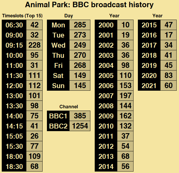 If you want an animal-based programme that seems as unstoppable as a rhino-led restaging of the rollerskating scene from Some Mothers Do ‘Ave ‘Em, then Animal Park is the show for you. Running for seventeen series and a total of 221 episodes, this series following the fortunes of keepers and animals at Longleat Safari Park is a definite stayer. Certainly enough for each episode to have been broadcast an average of 7.44 times.