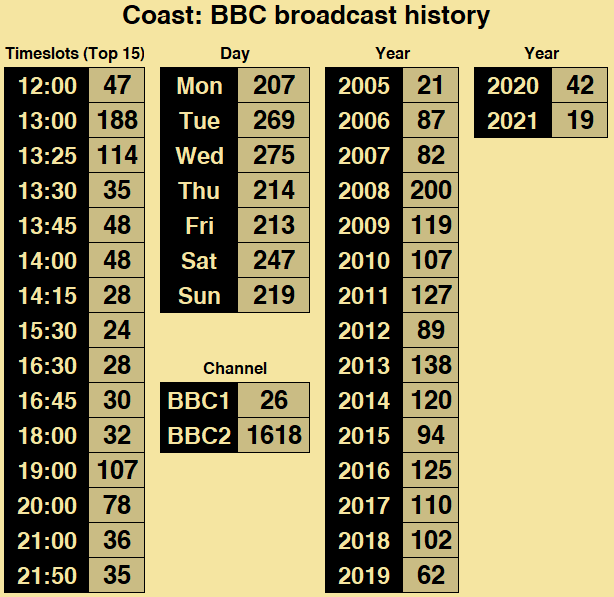 There were just 75 episodes in total, and yet the series has clocked up an astonishing 1,644 showings on BBCs One and Two. Surely at this point regular viewers will have a familiarity with Britain’s coastline to rival Google Street View.