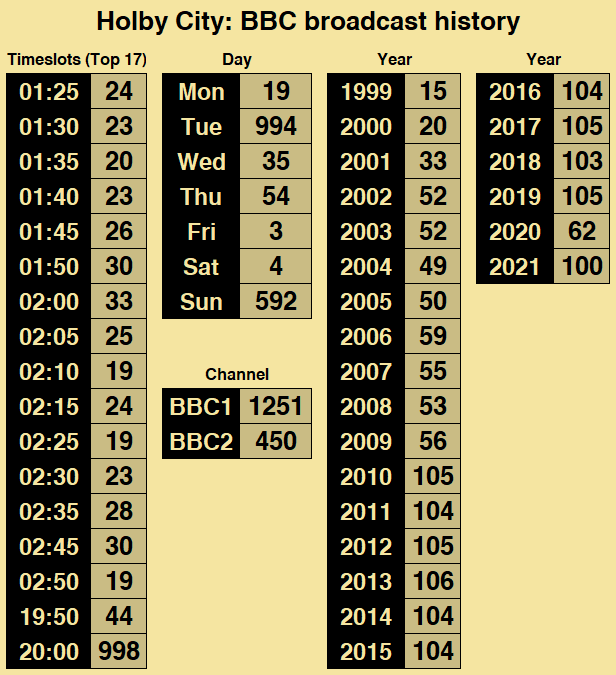 A few quick checks revealed something curious: while most programme listings were completely correct, anything airing between midnight and 6am (between 2010 and 2021, the post-Genome era) had the wrong time listed, showing up as anything from 7am to 9am. And that poses a problem for all those Sign Zone repeats of major programmes, which I am counting because standards. The few times this has come up so far, there has been a simple (if inconvenient) solution. Go through the online listing for each programme broadcast date, and fix the times on my list manually. And then I arrived at Holby City. Which has enjoyed overnight signed repeats 617 times. Sigh.