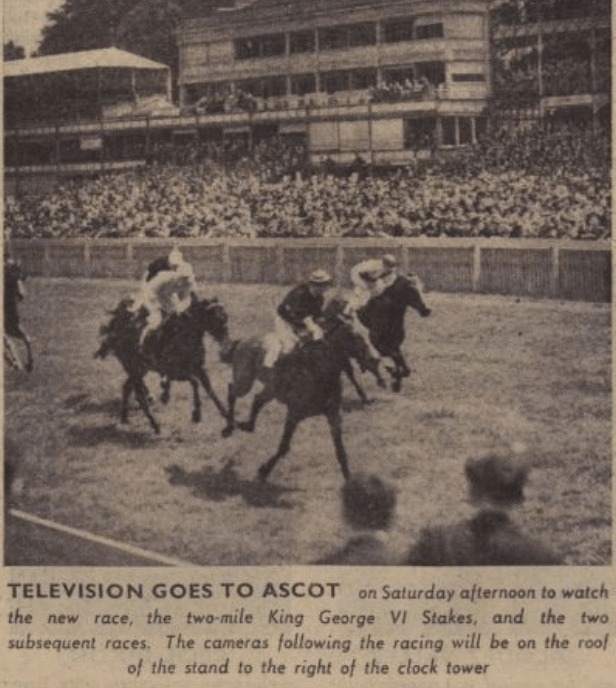 Anyway, fast forward to 1946, and the reopened Television Service is now in a position to start covering horse racing properly. Television had certainly picked a suitably special occasion to cover. The two-mile King George VI Stakes is a racing event at Ascot that continues to this day, and BBC cameras were present for the very first ‘Stakes race in 1946. Or rather, ‘BBC Camera’ – the practice of mounting a camera to a vehicle capable of keeping up with racehorses still hadn’t come to fruition, and so a single BBC camera was affixed to the roof of the main stand, just to the right of the clock tower.