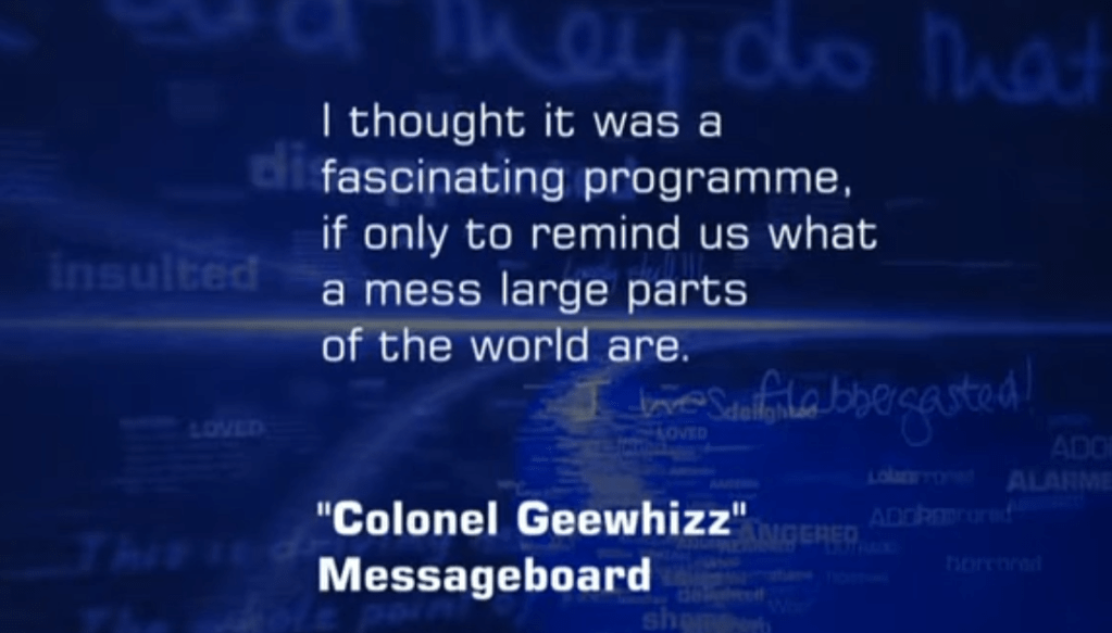 Following Tel’s departure, Jeremy Vine took over from 2008 to 2018, with Tina Daheley currently hosting the series, but let’s be honest. With a multitude of other ways to express opinions on #CurrentTelly it’s a programme that seems incredibly anachronistic in this day and age. Sure, you could argue that at least having your views expressed on air (not least now the format is closer to Channel 4’s old Right To Reply) adds legitimacy to the series, but I’m going to counter with the fact that, around the end of the noughties, in an effect to move with the digital cyber-times, the series accepted comments submitted via the programme’s online messageboard. Where, instead of square old ‘names’ and ‘locations’, people could express comments under their wacky online handles, like ‘Pancho Wilkins’, ‘Colonel Geewhizz’ or ‘Alan997’.
