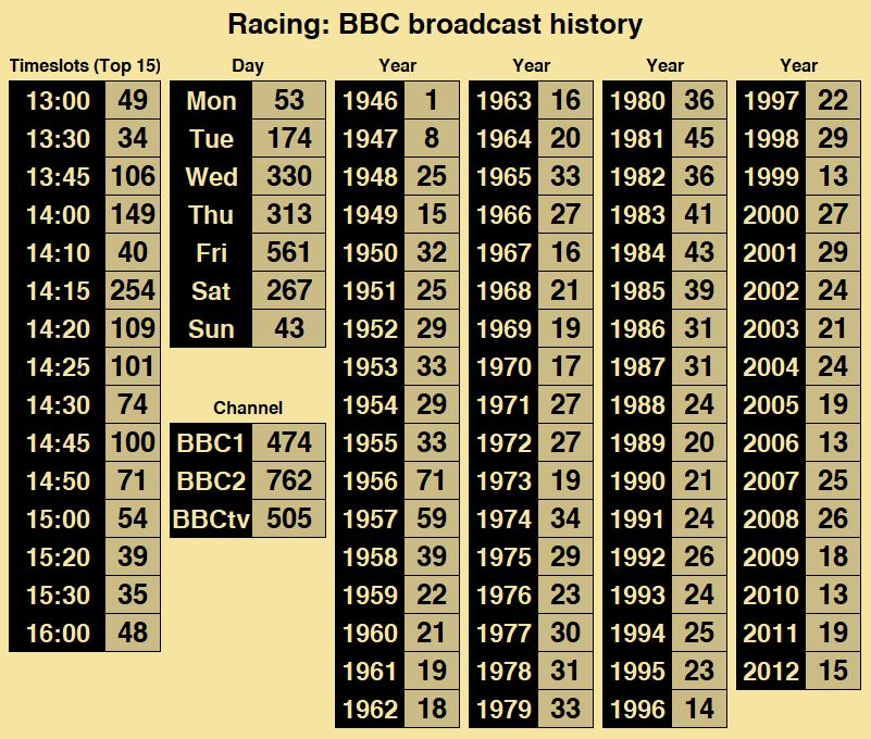 The table below doesn’t quite accurately convey the true extent of racing coverage on the Beeb – for many years, a large amount of the BBC’s racing coverage found itself covered within the Grandstand umbrella, and at other times racing shared a billing with up to three other sports in the TV listings. I’ve not included such instances in the totals, as that would only complicate matters. I make it about 237 instances of ‘Racing’ sharing a billing with other sports like this, if you want to amend the total yourself.