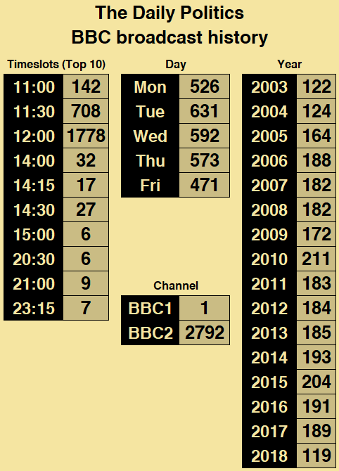 The new approach proved to be a successful one, so much so that the programme moved from three to five episodes per week from April 2005, with hour-long episodes on Tuesdays and Thursdays reduced to half-hours, with new half-hour episodes on Mondays and Fridays. By 2012, these five episodes were complemented by a sister show each Sunday, with the appropriately-named Sunday Politics differentiating itself from the main show by incorporating regional opt-outs allowing for local political affairs to be covered in appropriate depth. (NOTE: I’m treating Sunday Politics as a distinct entity, by the way.)