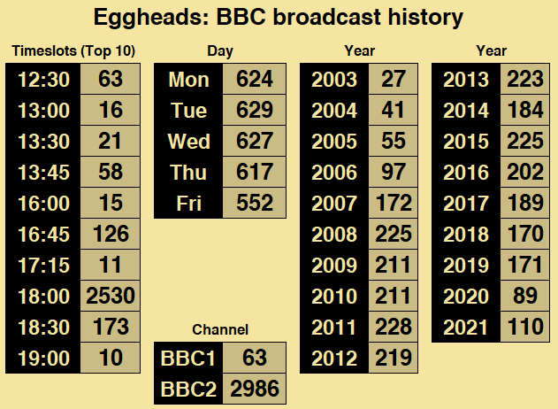 Well, it had mainly been a BBC One programme at first anyway. Of the first 70 broadcasts for Eggheads, 63 of them had been on BBC One. I’ll call for a steward’s enquiry over it quickly becoming popular, though. It took until 23 May 2005 for the ‘Heads to first arrive in the slot it’d be most closely associated with – weekdays at 6pm on BBC2, at which point it made a fleeting appearance in the weekly Barb Top Thirty for the channel – sneaking into the arse-end of the chart for the first couple of weeks in the teatime slot (between 24th and 29th place on the weekly lists for weeks ending 29 May 2005 and 5 June 2005, if you must know), but after that it disappeared from the Beeb ratings for BBC2 until August of that year, when a week of airings at 17:15 – a lead-in for a fresh batch of Weakest Links – saw it reach the BBC Two top ten for the first time. It wouldn’t return to that BBC2 top ten until the following May, and even then only for a single episode.
