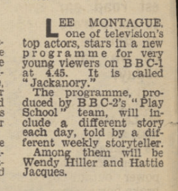 The scheduling helped the new programme gather an audience, Whitby’s idea being that the timeslot would attract passing attention of adults as they returned home from work, and the involvement of mainstream actors would help keep their attention fixed firmly on the screen, sharing in the stories being read to the kids. That first six-week run also featured actors Wendy Hiller (a year before her third Oscar nomination for A Man for All Seasons) and Hattie Jacques, along with author Enid Lorimer.