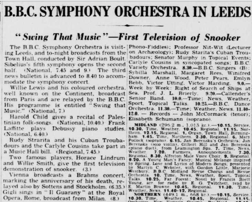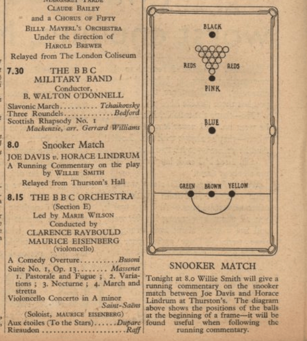 For a spectator sport where identifying colours such as yellow, green, brown, blue, pink and black is pretty darned integral, you’d reasonably expect it to only become a broadcasting event following the advent of colour television. Except, not only was it first broadcast long before BBC2 started pumping out colour programming, snooker was first beamed to the nation before television was a going concern. On Tuesday 10 December 1935, listeners to the London Regional Service were treated to fifteen minutes of commentary on a match-up between England’s Joe Davis, considered the world’s top player at the time, and Australian Horace Lindrum, then considered the globe’s secondmost snookersmith. As if to underline the challenge of describing the action to an audience who’d largely never seen a snooker table in their lives, the Radio Times printed one alongside that day’s radio listings.