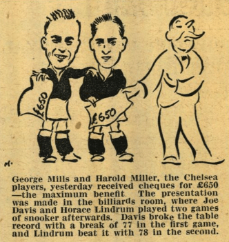 The report also included mention of the match’s status as broadcasting first, relating how commentator Willie Smith (himself a billiards champion who’d turned his hand to the increasingly lucrative snooker) told of missed sitters (causing “expressions of amazement from spectators”) during that inaugural summary. That match between the two would go on for several more days – at one point breaking so that cheques for £650 could be awarded to Chelsea footballers George Mills and Harold Miller before play continued – only to end with Joe Davis winning by 32 frames to 29, ending the series at one match apiece, and subsequently nullifying the bet. In short: a lot of snooker, then nobody won.