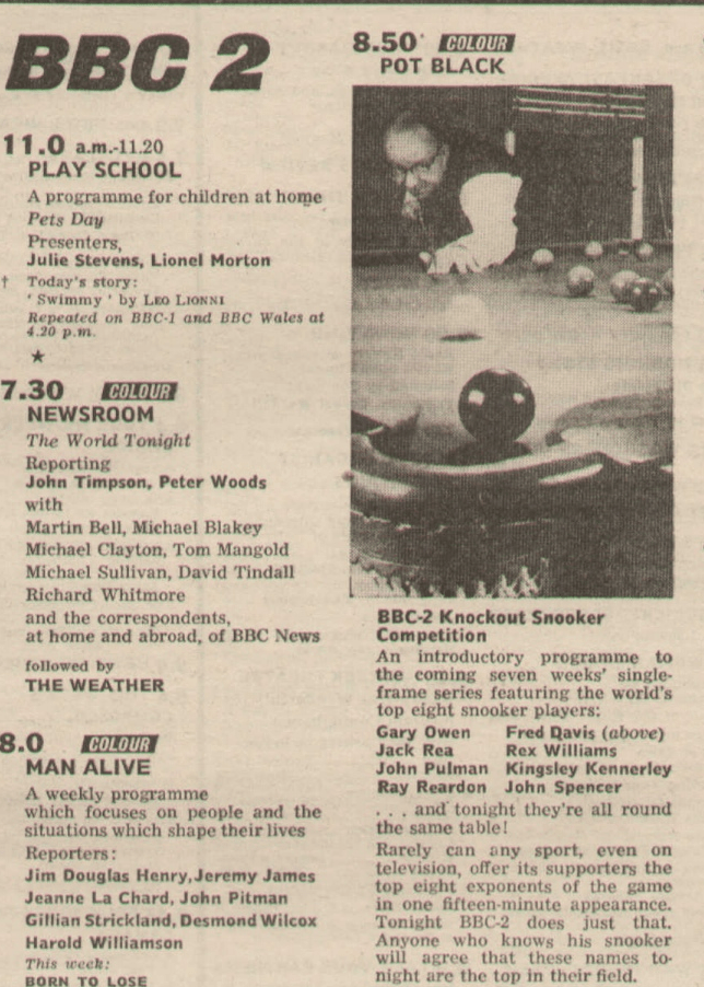 With the sport lacking a unifying ‘Match of the Day‘-style branding, actual tournament play went out under the title of, well, ‘Snooker’ (or variants thereof), taking it into this top ten position. And that’s because, well, there’s been rather a lot of it on the BBC over the years. More of it than you could shake Len Ganley at. And it goes back a lot further than one might expect.