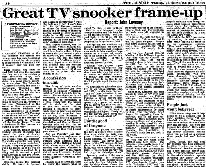 The real giveaway came on 28 January 1967. A invitation match on World of Sport between George Humphries and Ray Edmonds was billed as “a five frame thriller”. In the Sunday Times expose the following year, Edmonds came clean: “It was a five-frame thriller because we wangled it that way.”