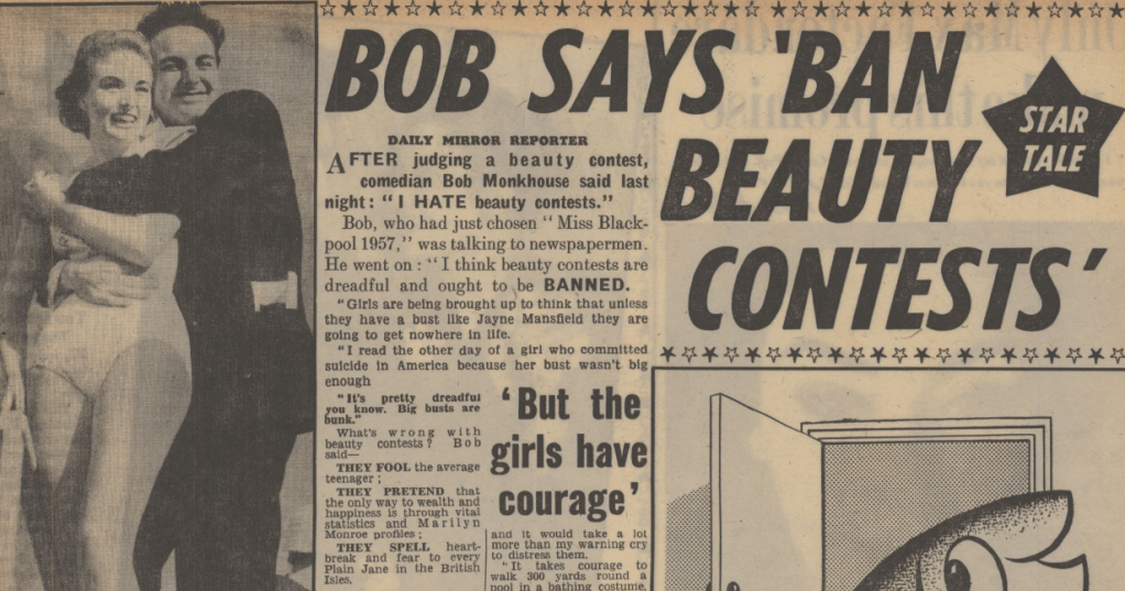 Williams (left) was picked as Miss GB in part by Lord Bob Monkhouse, who then went on to denounce the whole enterprise, but who probably didn’t hand back the appearance fee (Mirror, 30 Aug 1957).