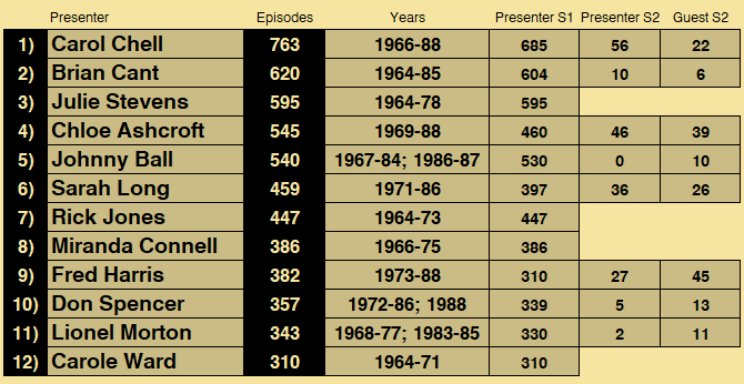 Firstly, here’s a list of PLAY SCHOOL PRESENTERS WITH THE GREATEST NUMBER OF APPEARANCES. Broken down into pre- and post-relaunch totals for good measure: