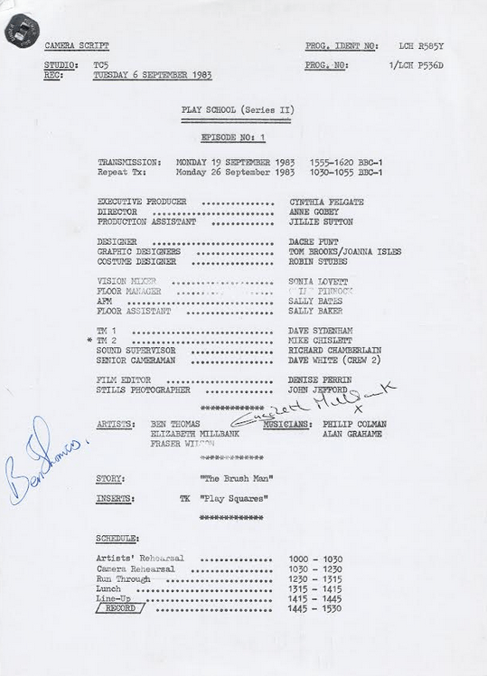 How about some scans? Here’s the front page of the script from Play School’s first episode of Series Two (Recording Tue 6 Sep 1983, TX Mon 19 Sep 1983):