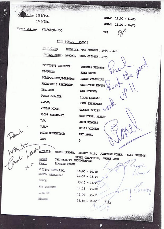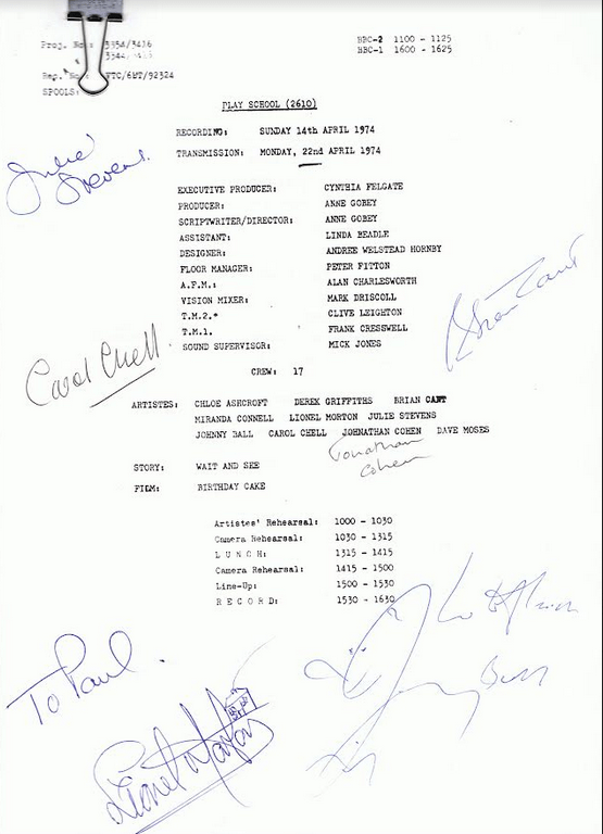 Now, as splendid as screencaps of Tim Brooke-Taylor being frumpy are, how about an extra Play School lists (and if you don’t like lists, what are you doing here?), plus: some camera scripts and a gallery of Play School photos, each courtesy of Paul R Jackson?