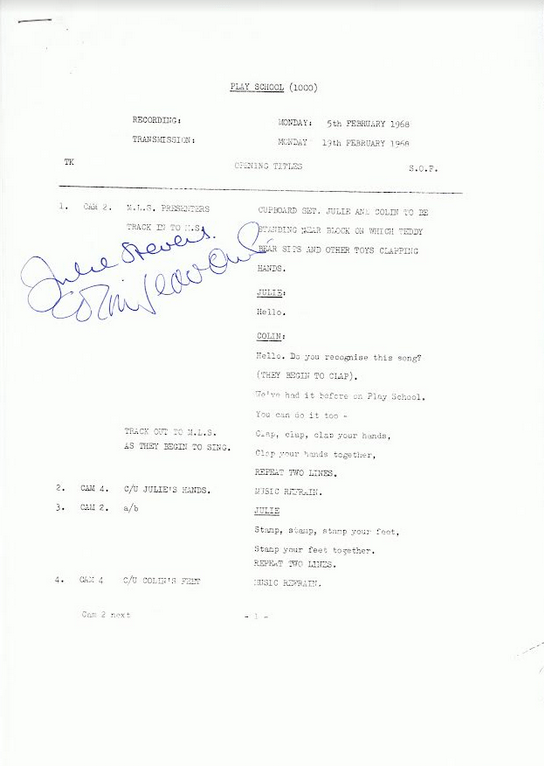 Here’s the front page of the 1000th Play School script (Recording Mon 5 Feb 1968, TX Mon 19 Feb 1968):