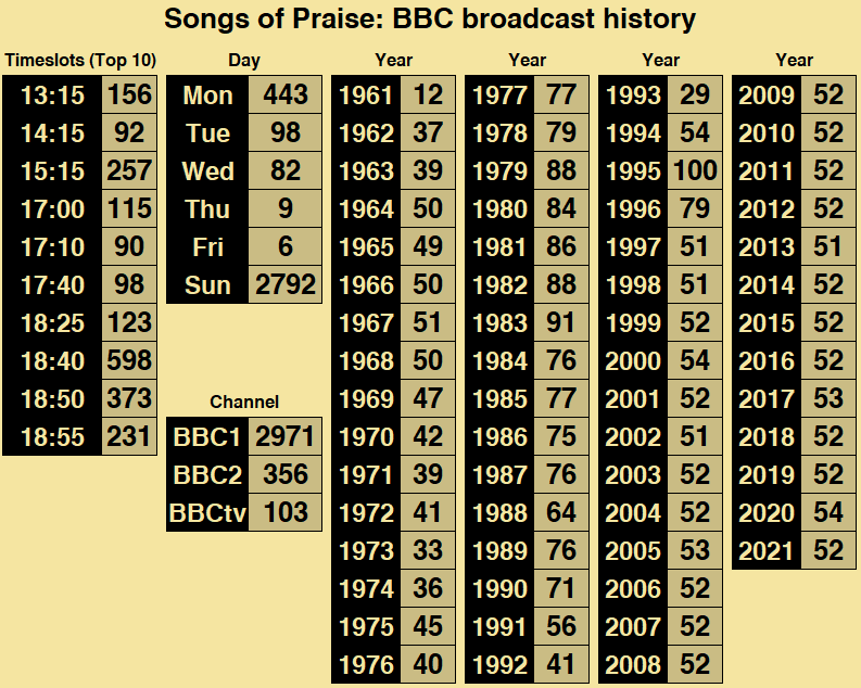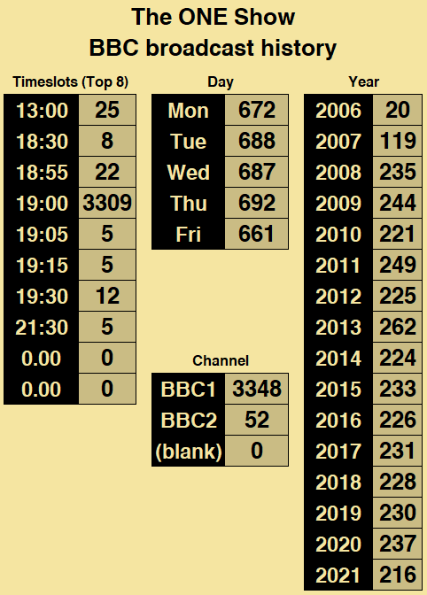 Right, to try and get some kind of vaguely accurate figure here, I’m going to go with the following rule: If it’s tagged as Match of the Day, and the bulk of the content is footage from a football match (or matches, either live or highlights) of a contemporary match, it counts. If it’s not one of those things (so, Kickabout et al), or doesn’t have the MOTD branding, it doesn’t count. Settled? Good.